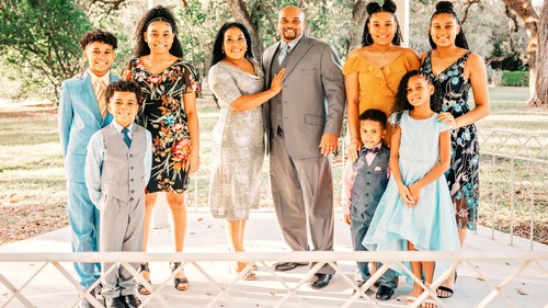 Dr. Jones, his wife Kamica, and their seven children: Jazz, Joy, Jewel, Jax, June, Jet, and Jay.